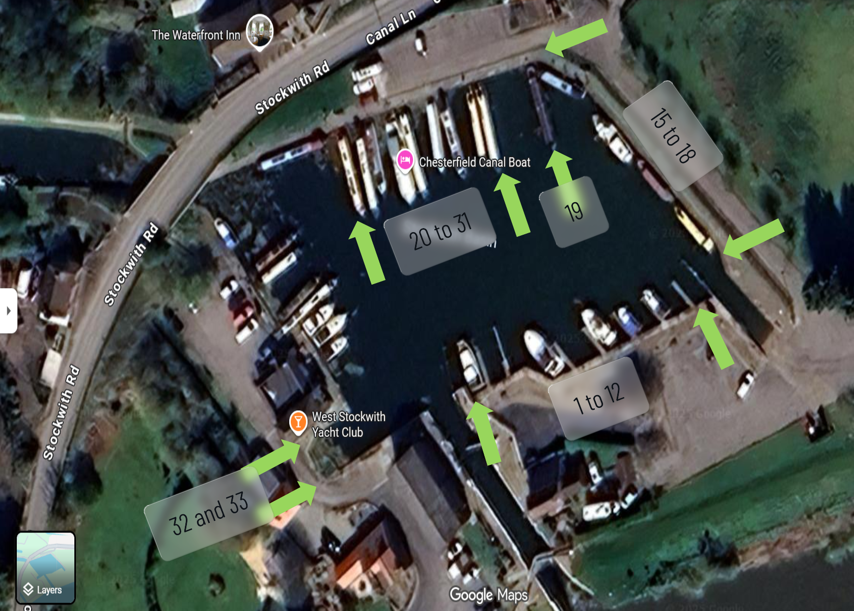 All boats moored on the North (pub) side of the basin, can only be accessed via the stern - i.e. the boat must be moored 'Stern In' toward the bank side. The centre of the craft is secured to a stanchion in the water. A personal viewing of the site is recommended in advance of purchasing a mooring.